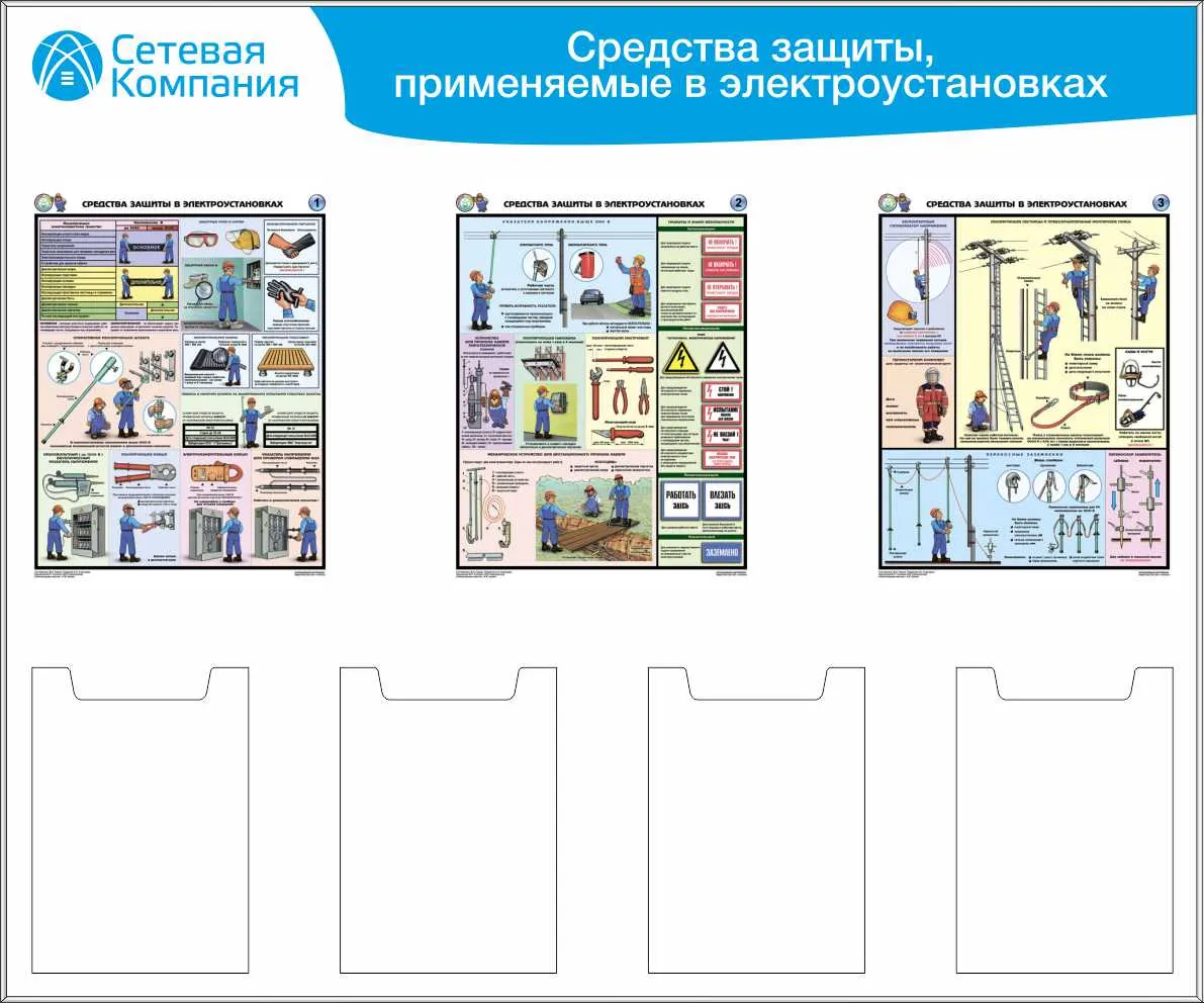 Стенд для ОТ средства защиты, применяемые в ЭУ, 3 плаката А3, 4 карм. А4 (1 200х1 000; Пластик ПВХ 4 мм, Алюминиевый профиль)