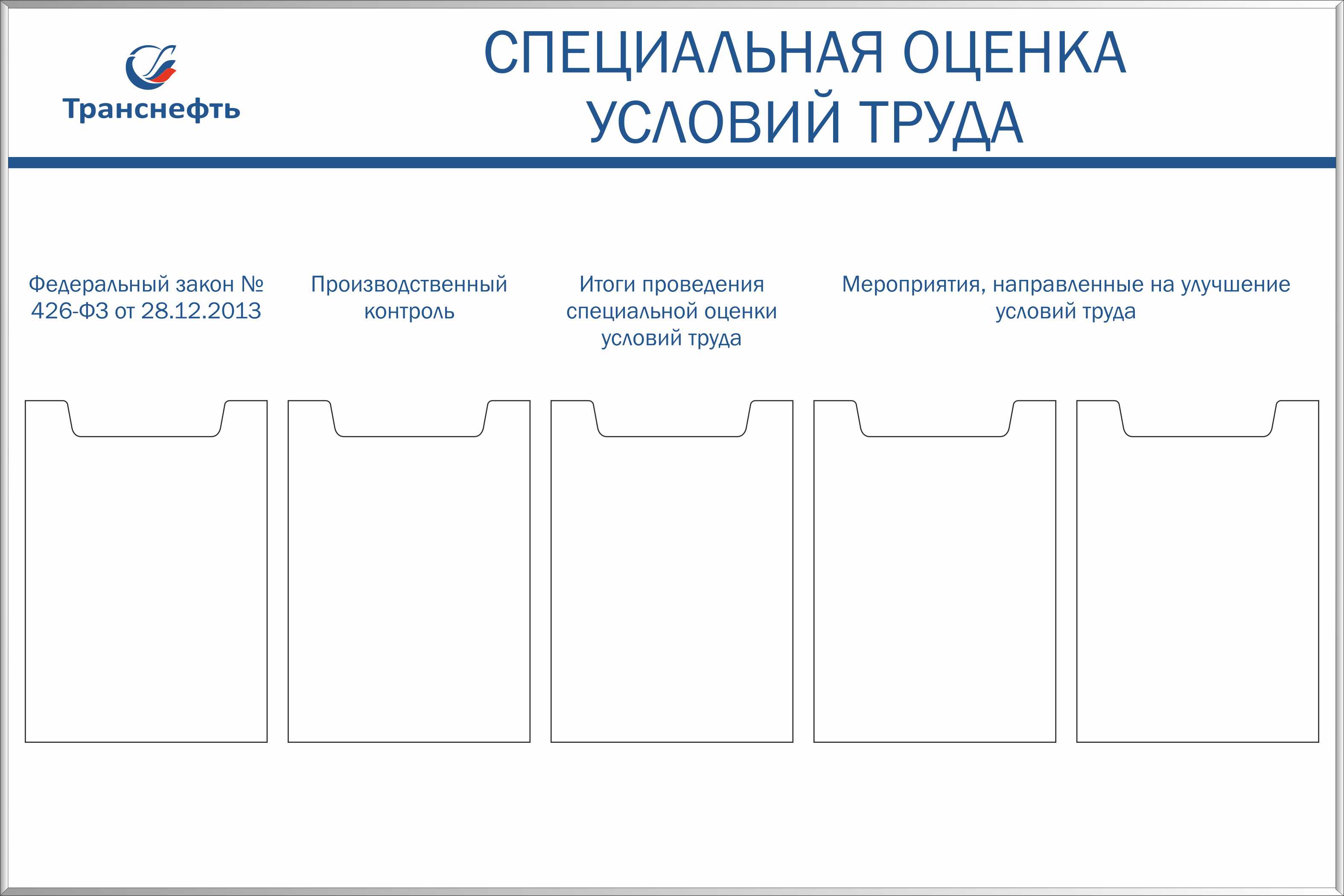 Стенд «Специальная оценка условий труда», 5 карманов А4 (1200х800; Пластик ПВХ 4 мм, алюминиевый профиль; )