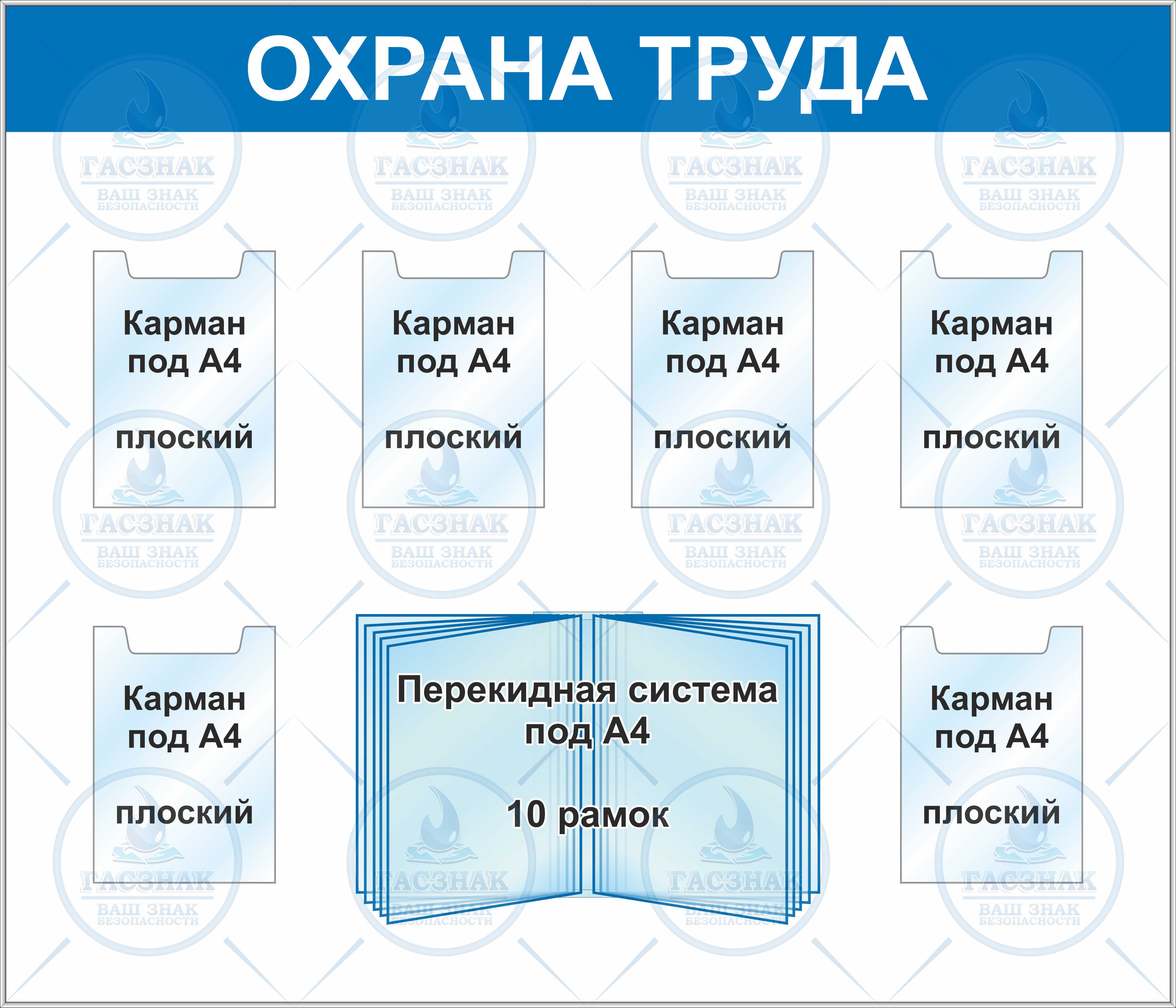 Характеристика: Охрана труда (6 карманов A4 плоских вертик., перекидная система A4 на 10 рамок вертик.)
