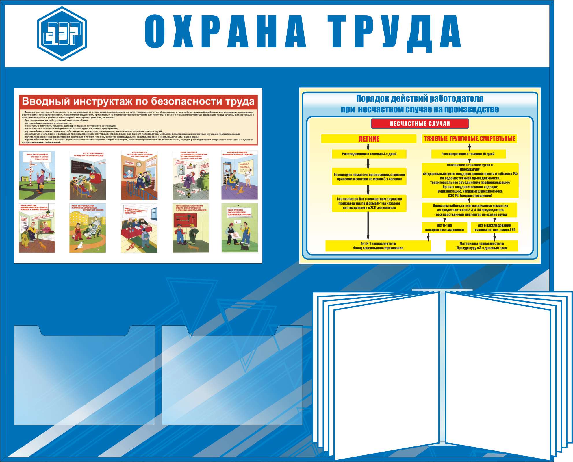 Стенд Охрана труда, ламинация защитной пленкой 25мк, вводный инструктаж по безопасности труда, трудовой кодекс (ОТ), классификация несчастных случаев, обязанности работодателя при несчастном случае., Логотип (1200х1000; Пластик ПВХ 4 мм, пластиковый профиль; Пластиковый) (полноцветная широкоформатная печать, карманы крепятся на стенд при помощи дистанционных держателей 5мм, декоративных шурупов), Вводный инструктаж по охране труда, 1 шт. ПЛВ04-2 (Ламинированная бумага; А2)-1шт, Карман А4, горизонтальный, плоский-2шт, Перекидная система А4, 10 рамок-1шт
