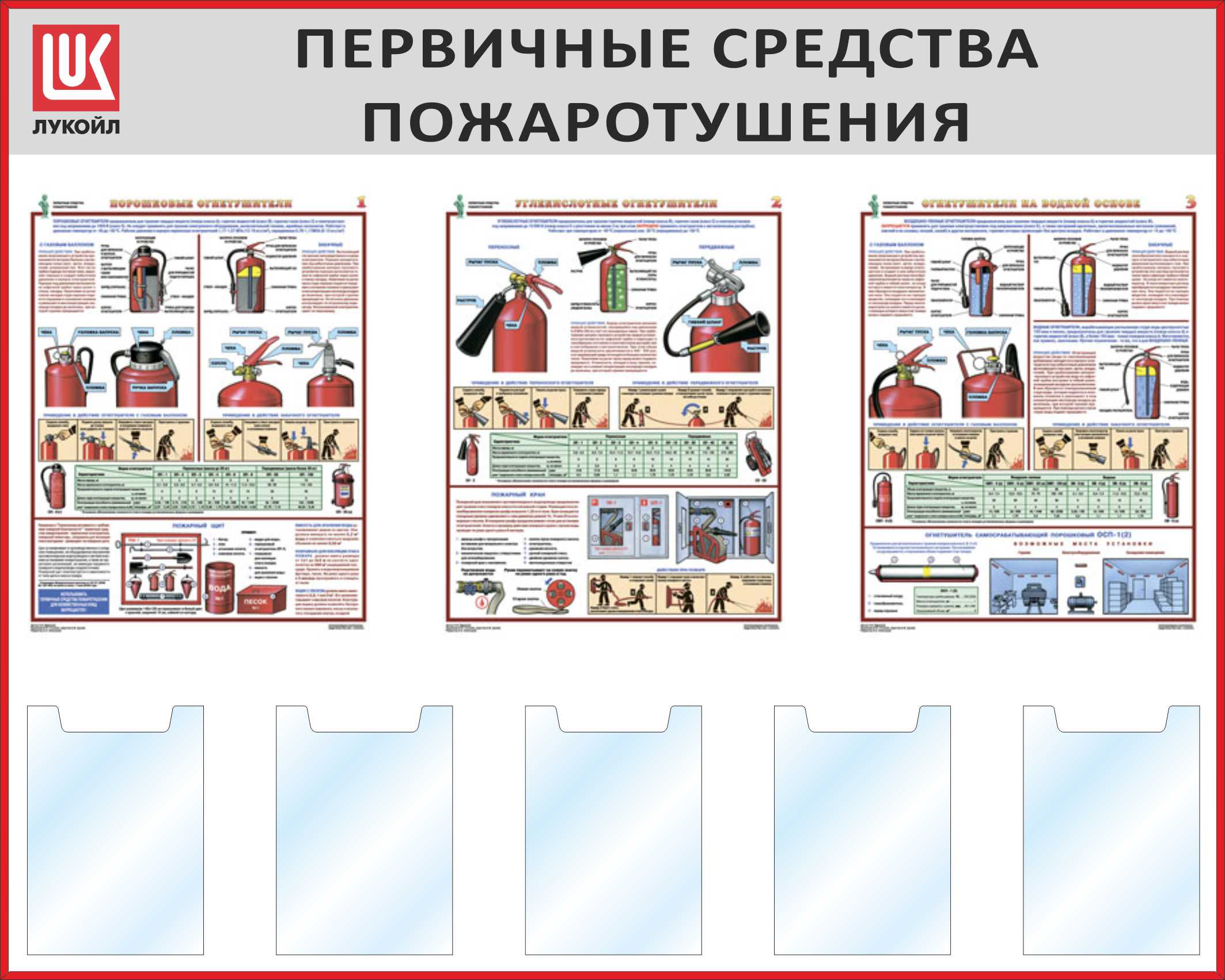 Стенд Первичные средства пожаротушения, 5 карманов А4, 3 плаката А2 (1500х1200; Пластик ПВХ 4 мм, алюминиевый профиль; Алюминиевый профиль)