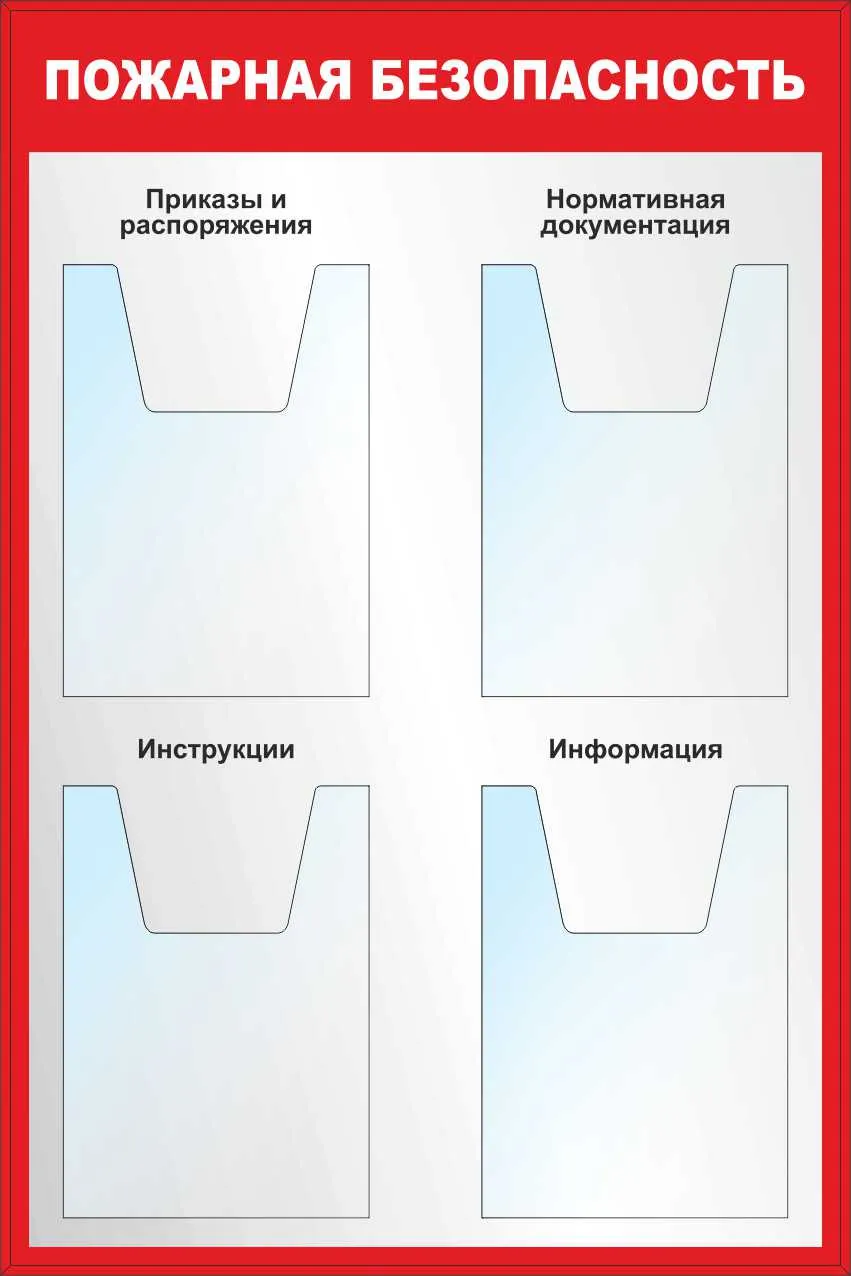 Стенд Пожарная безопасность, карман А4 плоский-5шт,карман А4 объемный-5шт (1400х1200; Пластик ПВХ 4 мм, алюминиевый профиль; Алюминиевый профиль)