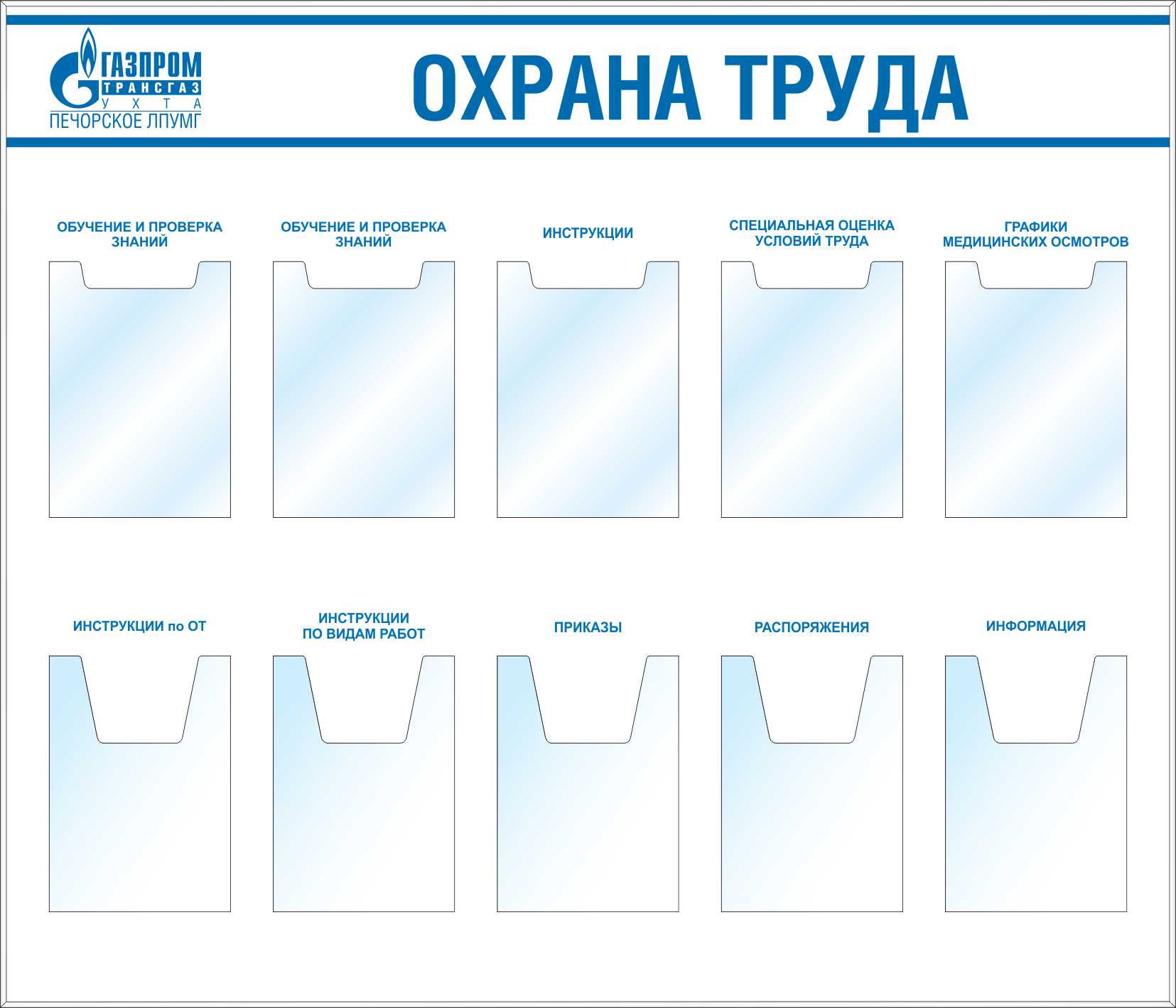 Стенд Уголок охраны труда 1200х1000 (пластик ПВХ 4 мм, 6 плоских карманов А4, 2 плоских горизонт. карманов А4), логотип Газпром трансгаз (Пластик ПВХ 4 мм , пленка самоклеющаяся, алюминиевый профиль) (; Пластик ПВХ 4 мм , пленка самоклеющаяся, алюминиевый