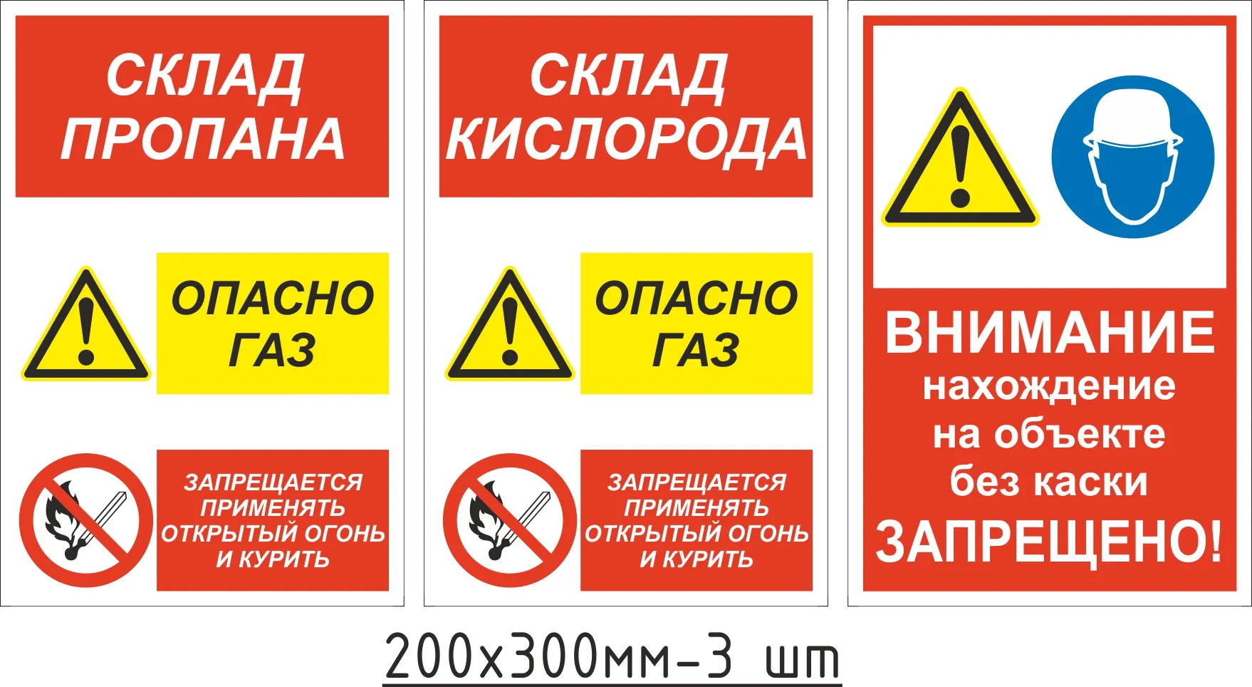 Комплект табличек: Склад пропана Склад кислорода Без каски запрещено