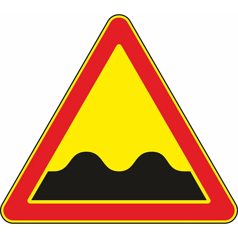 «Неровная дорога» сообщает водителю о том, что впереди — участок с дорожной поверхностью, на которой возможны волнистость, ямы и прочие неровности. Знак устанавливают в основном на аварийных участках дорог или тех, где ведутся ремонтно-восстановительные работы. Увидев этот знак, водитель должен сбавить скорость и приготовиться к выезду на участок с неровным покрытием. Если колесо попадет в яму на высокой скорости, это может стать причиной повреждения не только резины или диска, но и подвески машины.