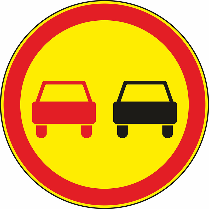 «Обгон запрещен» сообщает о запрете выхода на встречную полосу для обгона любых видов транспорта, не считая мотоциклов без коляски, гужевых повозок, мопедов или автомобилей, едущих со скоростью до 30 км/ч со специальным знаком. Устанавливается исключительно на двух- и трехполосных дорогах: как правило, на тех участках, где ограничена видимость потока транспорта, движущегося по встречной полосе. Протяженность действия знака в каждом случае разная: зависит от длины опасного участка и характера дороги в целом.