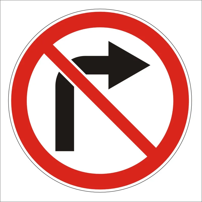 Знак «Поворот направо запрещен» вводит запрет для всех транспортных средств на выполнение правого поворота. Зона его действия начинается в месте установки и охватывает ближайшее пересечение. Не распространяется на маршрутные автомобили. Местом установки служит участок прямо перед пересечением, где действует запрет на выполнение маневра. Повороты в остальных направлениях и разворот не запрещены. Знак может размещаться вместе с табличкой, которая указывает на расстояние до начала зоны действия запрета.